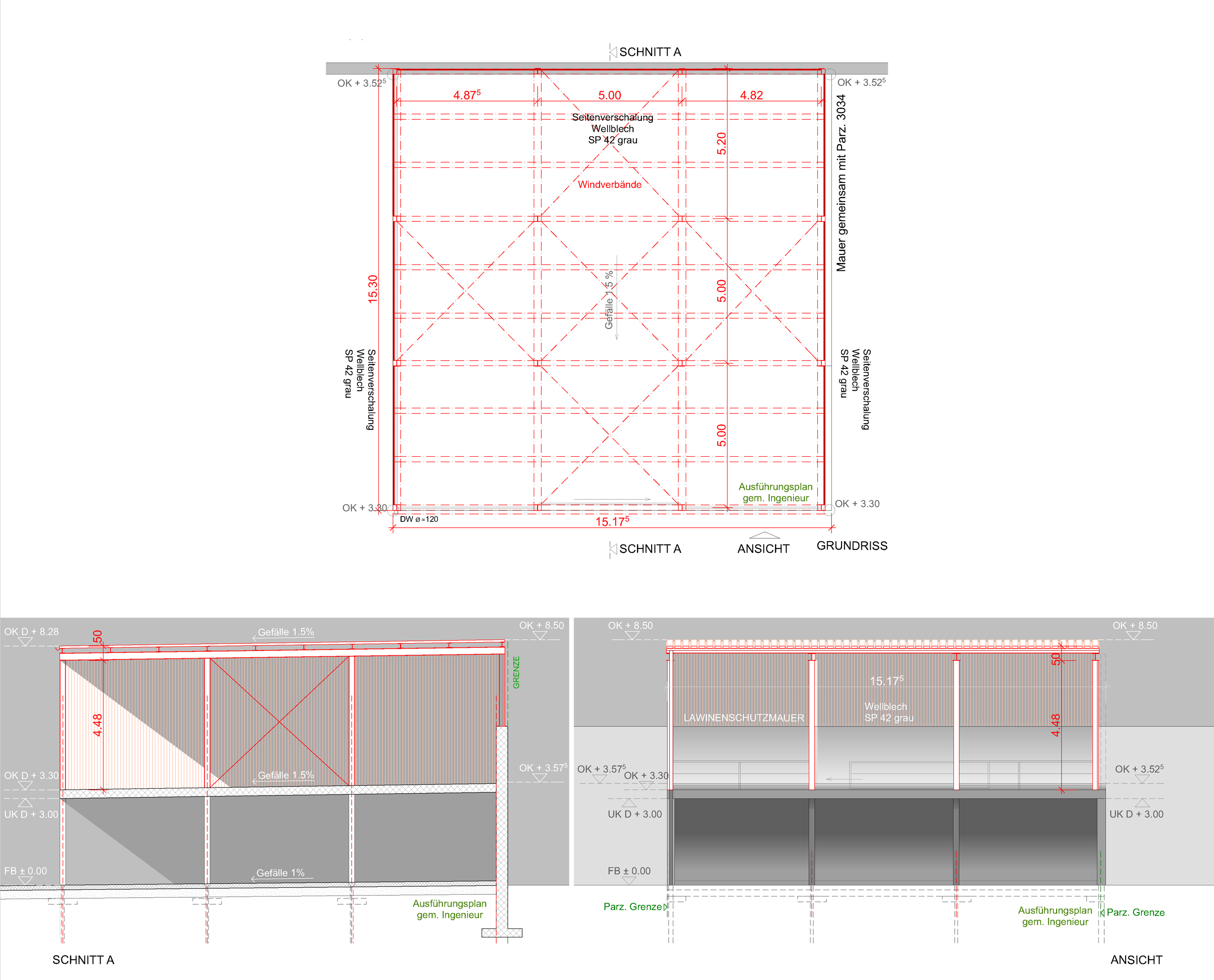 Zu Beginn der Überbauung konnten zwei Gewerbehallen realisiert werden: ein einfacher Materialunterstand sowie eine grosszügige Gewerbehalle in Holzbauweise. Die Gebäude wurden so konzipiert, dass sie künftig flexibel erweiterbar und vielseitig nutzbar sind. Dank der gewählten und eigens entwickelten Materialisierung konnte die Bauzeit deutlich verkürzt werden. Das zugrunde liegende Gebäuderaster ermöglicht variable Innenraumaufteilungen und unterschiedliche Nutzungen.